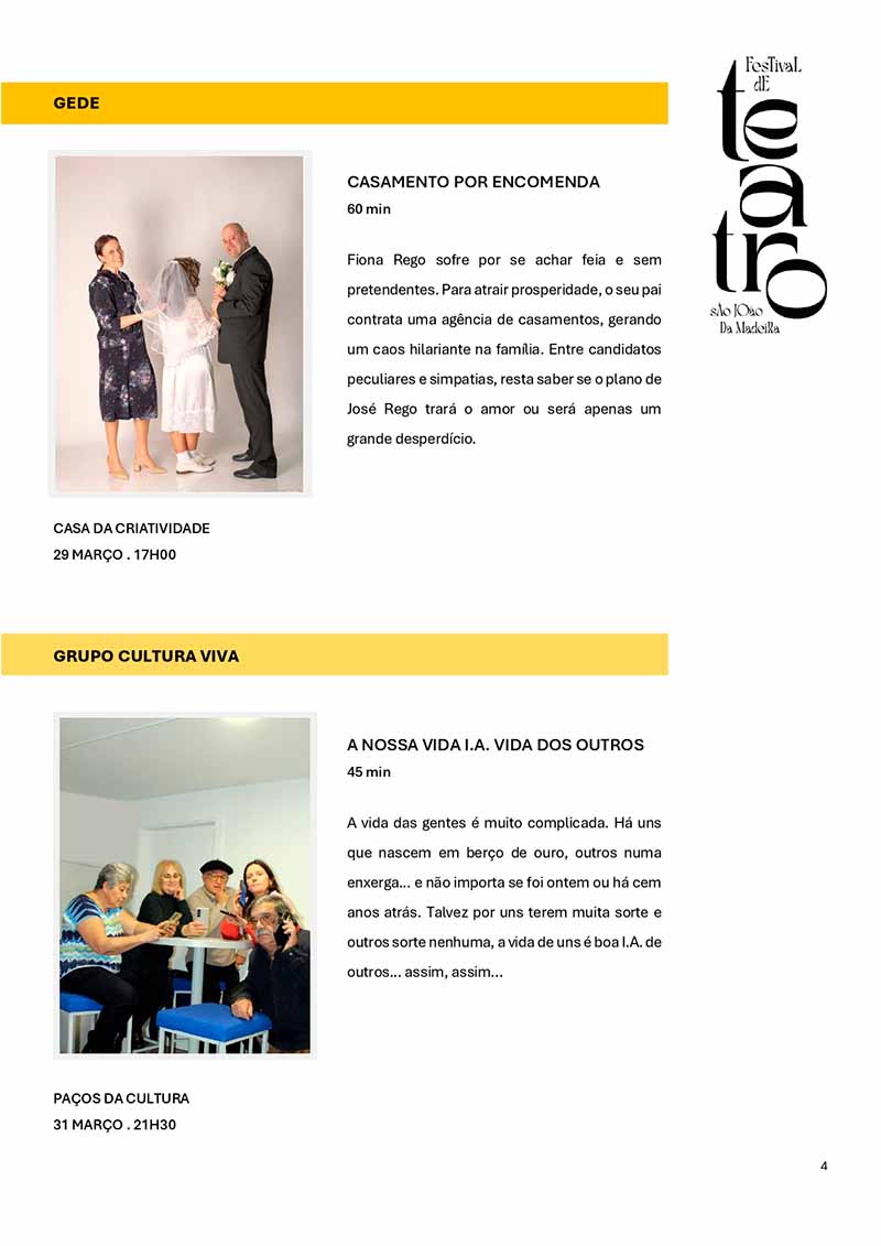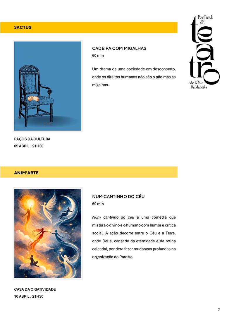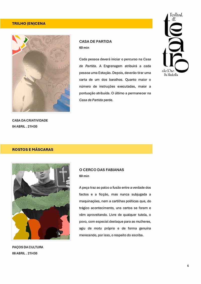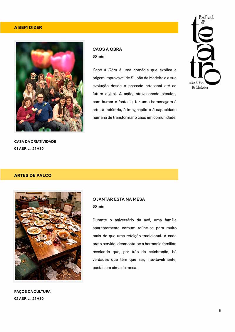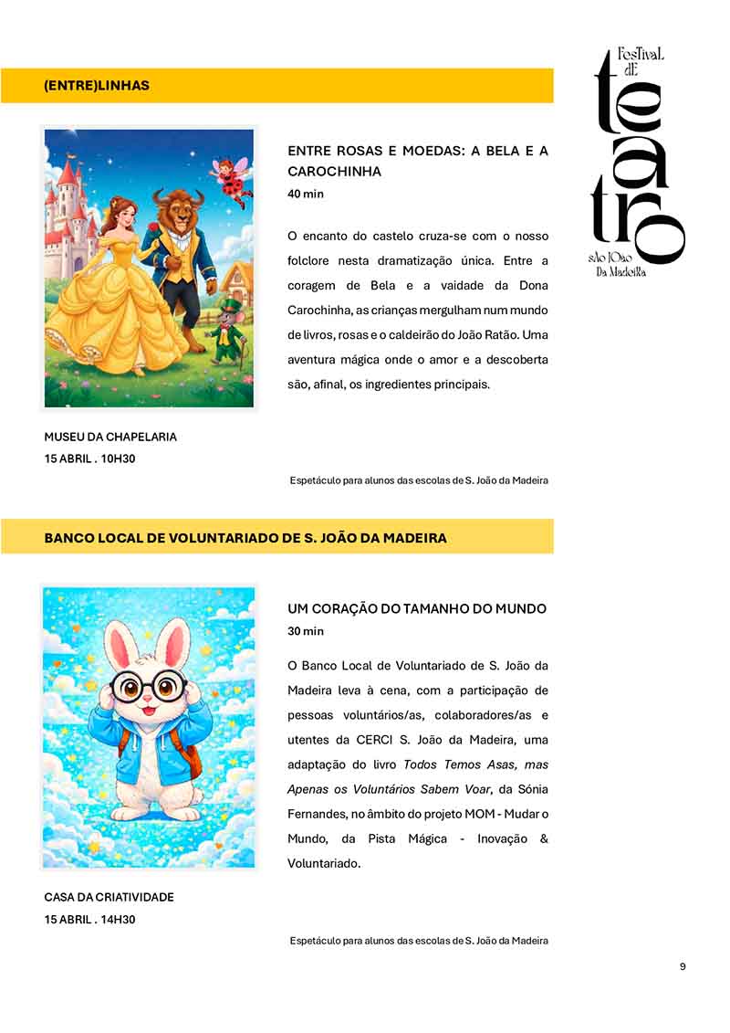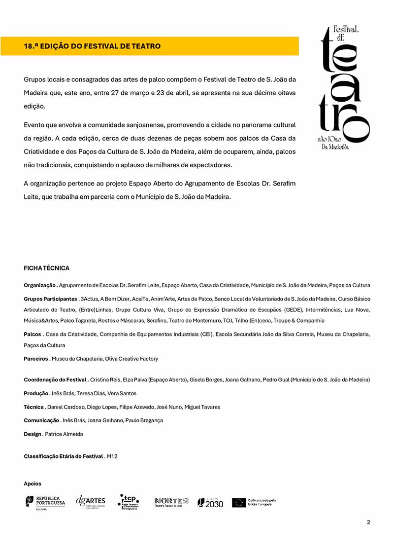 De 27 de março e 23 de abril, cerca de duas dezenas de peças sobem aos palcos da Casa da Criatividade e dos Paços da Cultura de S. João da Madeira, além de ocuparem, ainda, palcos não tradicionais, conquistando o aplauso de milhares de espectadores. A organização é da Câmara Municipal e Escola Dr. Serafim Leite, através do projeto Espaço Aberto.